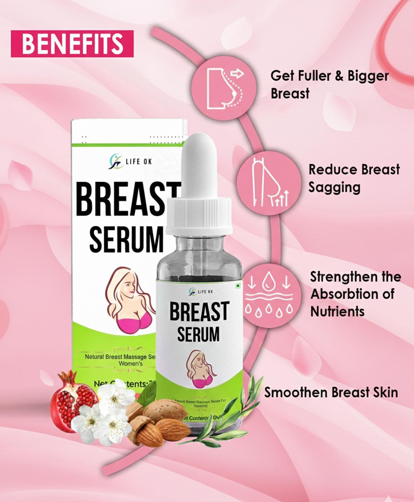LifeOk Breast Enlargement Serum contains potent herbal actives that help stimulate breast growth naturally by supporting healthy fat deposition and tissue expansion in the bust area.